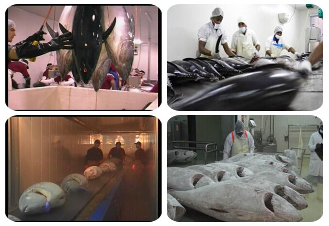 魚貨捕撈以后,經預冷-清洗-加工-急凍-超低溫冷藏,確保魚體溫度在-50°以下。